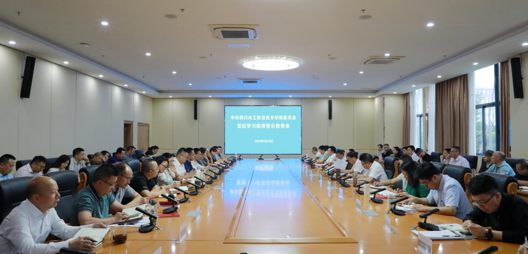 5月29日,学校在综合办公楼第一会议室召开党纪学习警示教育会。学校中层及以上领导干部参加会议。学校党委书记刘志勇参加会议并讲话,党委副书记、纪委书记、工会主席陈淑娟主持会议。