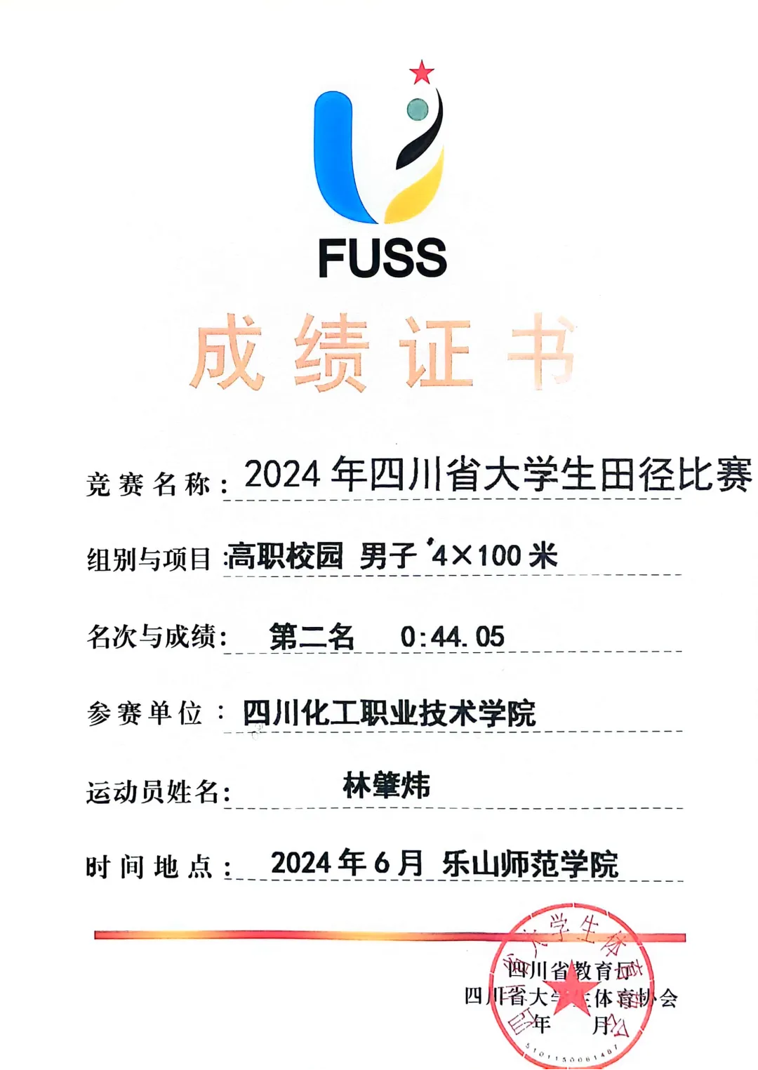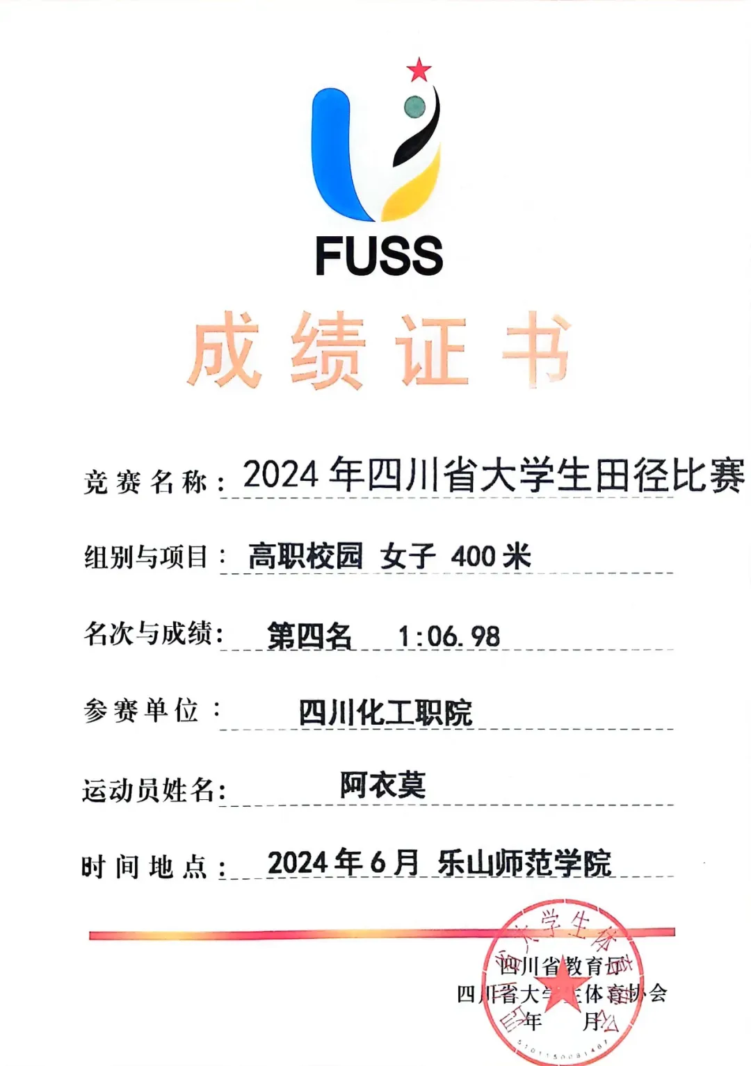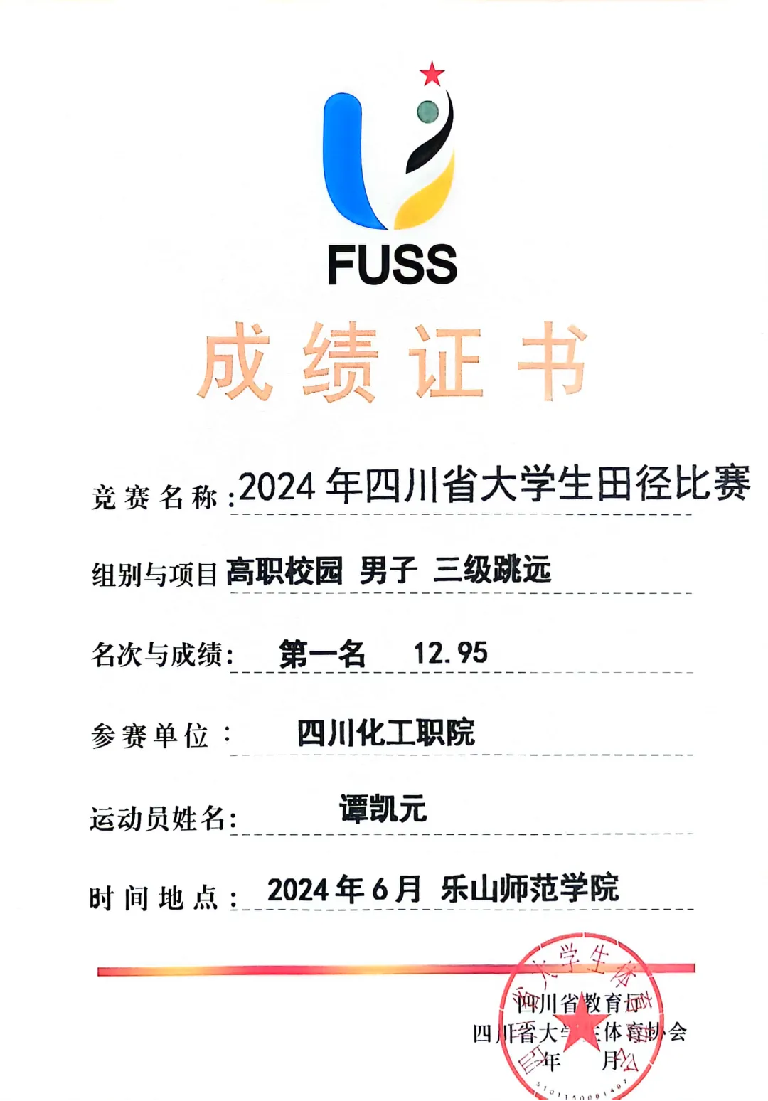 由四川省教育厅主办、四川省大学生体育协会执行的“2024年四川省大学生田径比赛”于2024年6月11日至14日在乐山师范学院和乐山市体育中心举行。此次比赛吸引了全省90多所高校的2000余名教练员和运动员参与。经过激烈角逐,学校田径队斩获了高职高专校园组团体总分第一名、男子团体总分第一名以及女子团体总分第四名,实现历史突破!