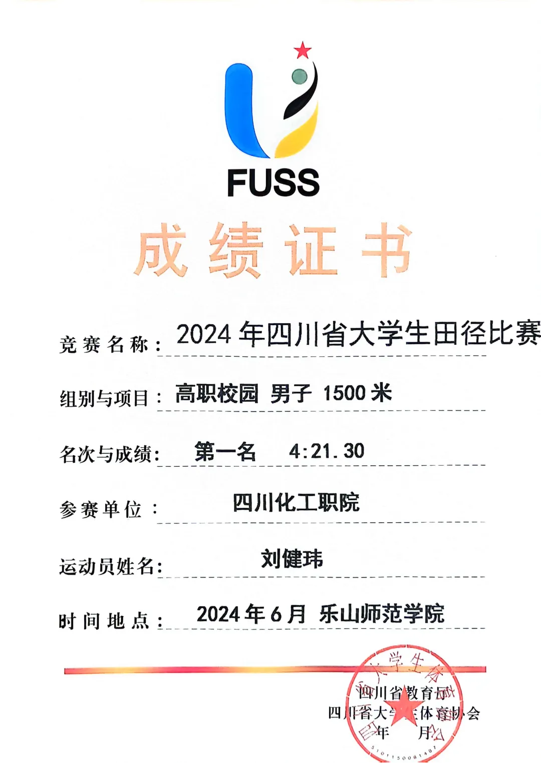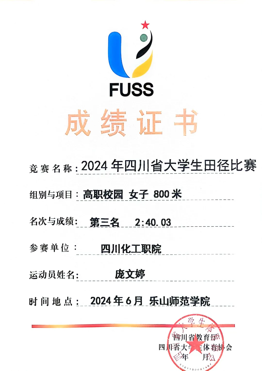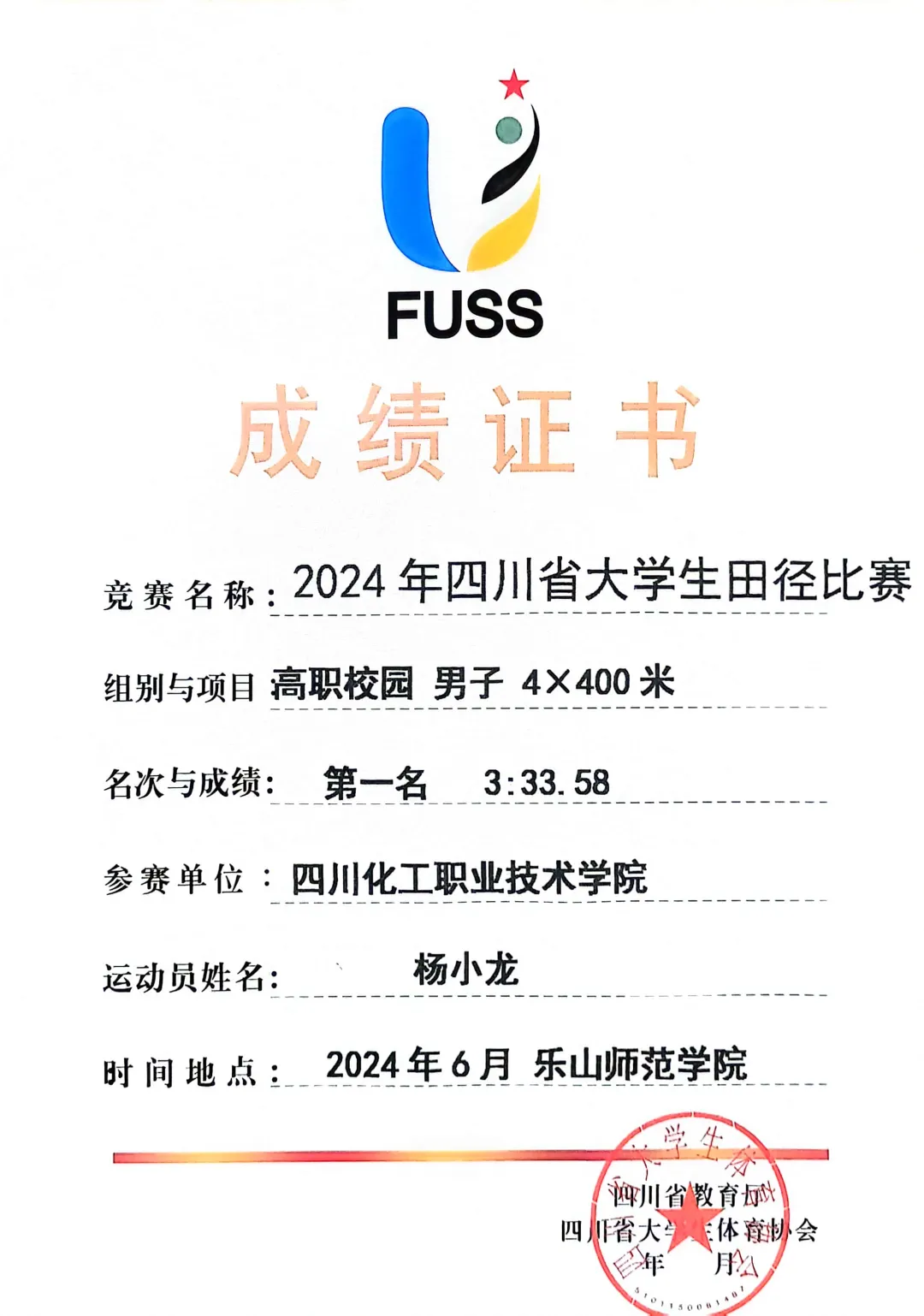 由四川省教育厅主办、四川省大学生体育协会执行的“2024年四川省大学生田径比赛”于2024年6月11日至14日在乐山师范学院和乐山市体育中心举行。此次比赛吸引了全省90多所高校的2000余名教练员和运动员参与。经过激烈角逐,学校田径队斩获了高职高专校园组团体总分第一名、男子团体总分第一名以及女子团体总分第四名,实现历史突破!