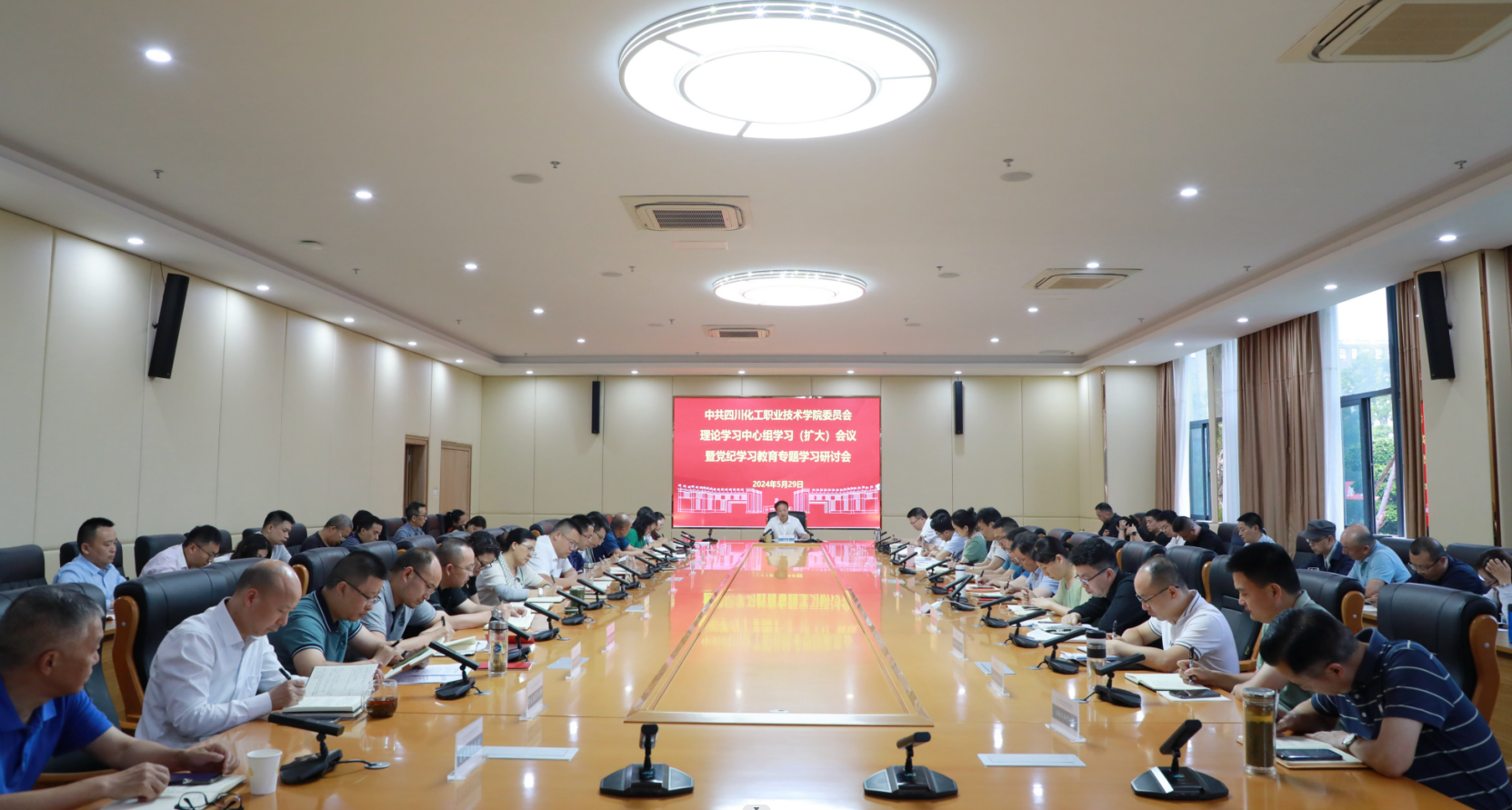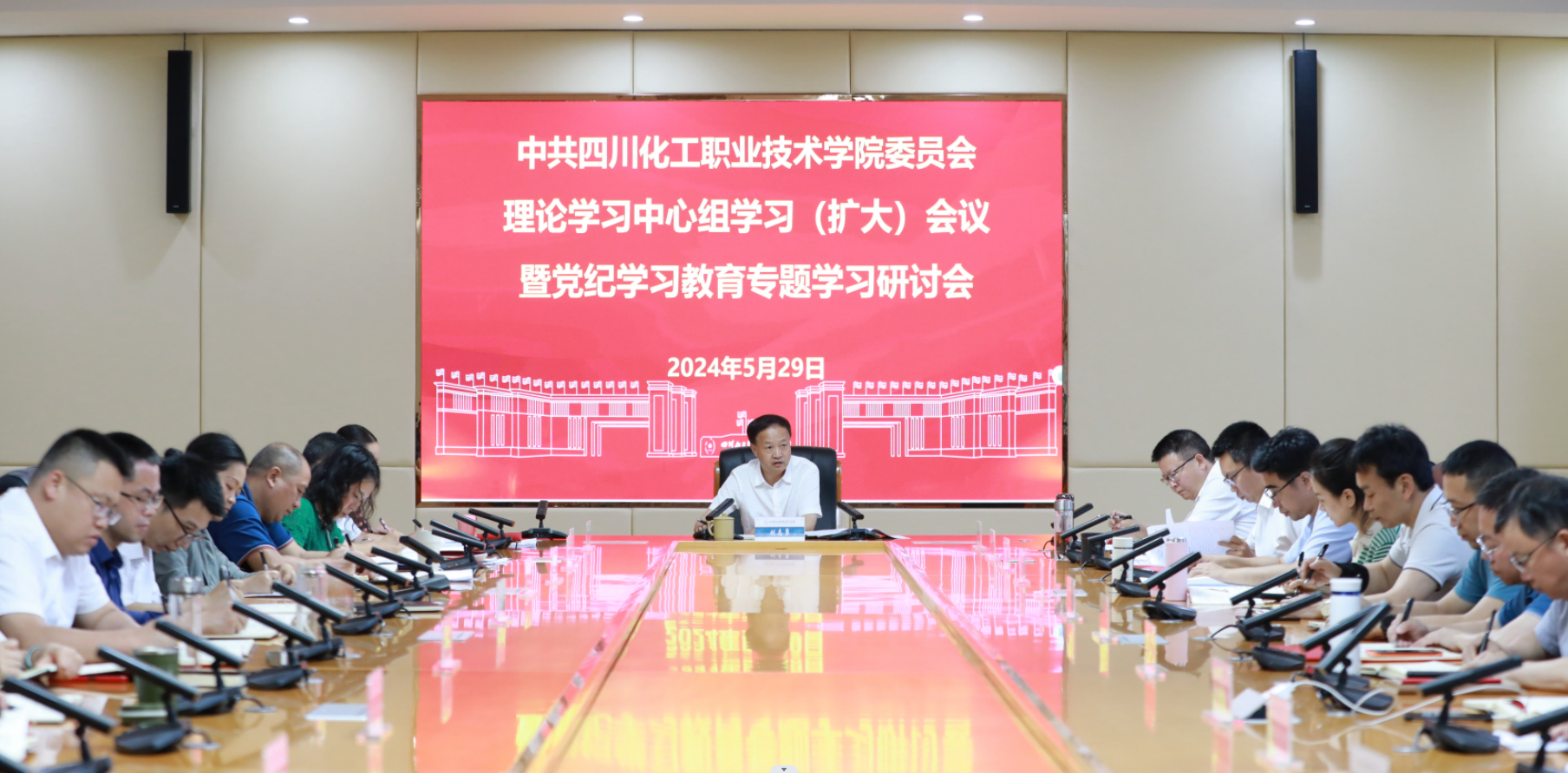 2024年5月29日,学校在综合办公楼第一会议室召开党委理论学习中心组学习(扩大)会议暨党纪学习教育专题学习研讨会,学校党委书记刘志勇主持会议并讲话。学校党委理论学习中心组成员、中层及以上领导干部参加会议。
