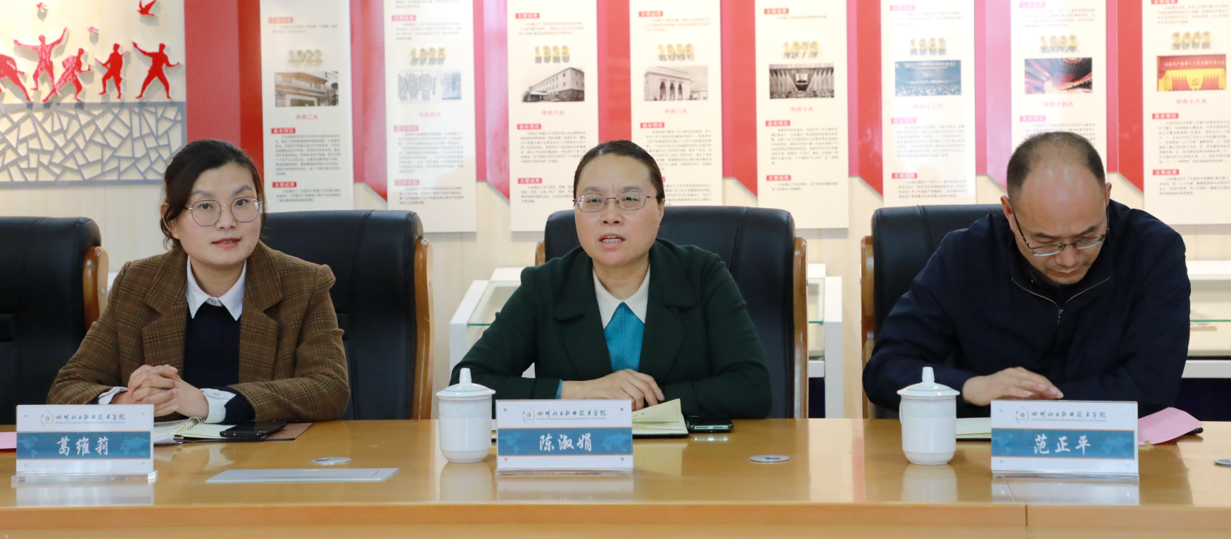 2023年3月17日,内江职业技术学院来校开展校园文化交流座谈。学校党委副书记陈淑娟出席交流座谈会并致欢迎词。内江职业技术学院党委常委,宣传部、统战部部长李万春,马克思主义学院副院长谢敏、教授崔显艳,学校党委委员,党委宣传部·党委统战部部长葛维莉,基础部直属党支部书记、马克思主义学院院长范正平,基础部直属党支部副书记、基础教学部副主任周圣毅参加交流座谈会。座谈会由党委宣传部•党委统战部副部长张霞主持。