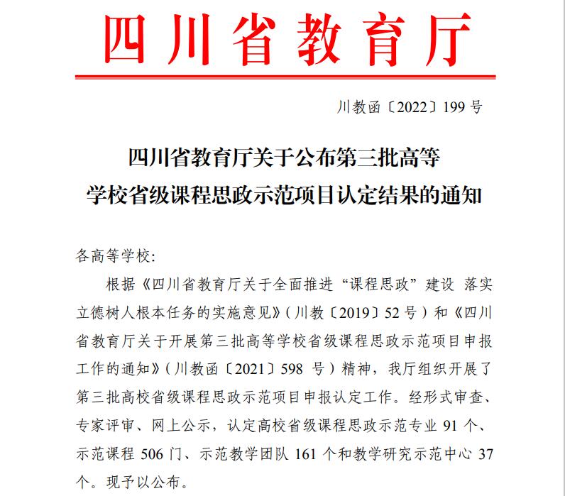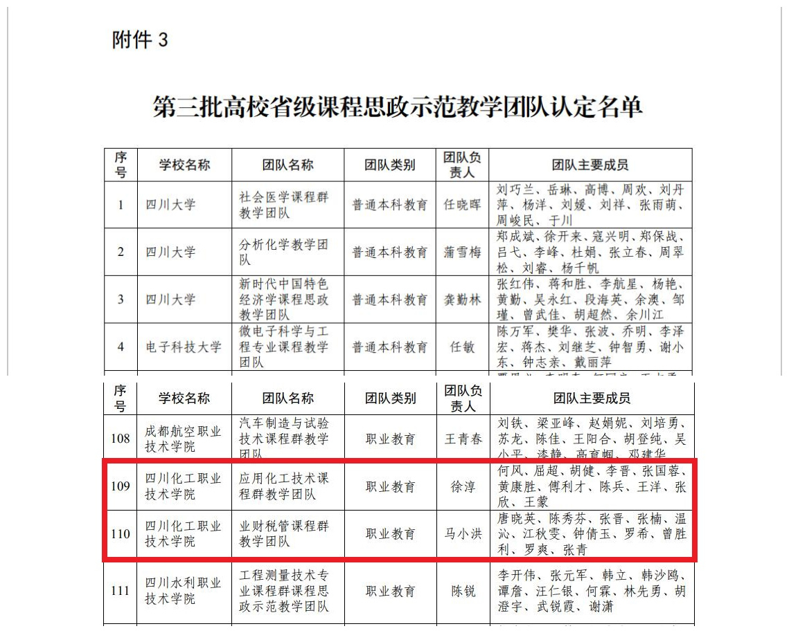 近日,四川省教育厅公示了第三批高等学校省级课程思政示范项目的认定结果。学校“应用化工技术”专业被认定为省级“课程思政”示范专业;学校“应用化工技术课程群教学团队”“业财税管课程群教学团队”被认定为省级课程思政示范教学团队;学校《业财一体信息化应用》《压力容器结构与制造》《化工总控工操作技术》《焊接质量检验》课程被认定为省级“课程思政”示范课程。