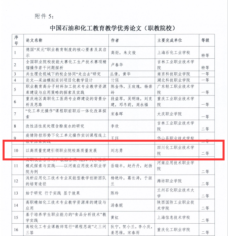 近日,中国化工教育协会公布了第六届中国石油和化工教育教学成果的评选结果,由机械工程学院党总支副书记、院长任小鸿主持的“构建新型大师工作室,培养新时代高职化工工匠的探索与实践”荣获第六届中国石油和化工教育教学优秀成果“一等奖”;由学校党委副书记、院长文申柳主持的“基于‘易班——诊改’双平台,构建‘1234’精准思政、协同育人的创新与实践”、由马克思主义学院教授唐晓英主持的“以‘八个统一’为指引的‘451’高职思政课教学模式研究与实践”荣获第六届中国石油和化工教育教学优秀成果“二等奖”;由党委书记刘志勇撰写的《以高质量党建引领职业院校高质量发展》论文荣获第六届中国石油和化工教育教学优秀论文“二等奖”。