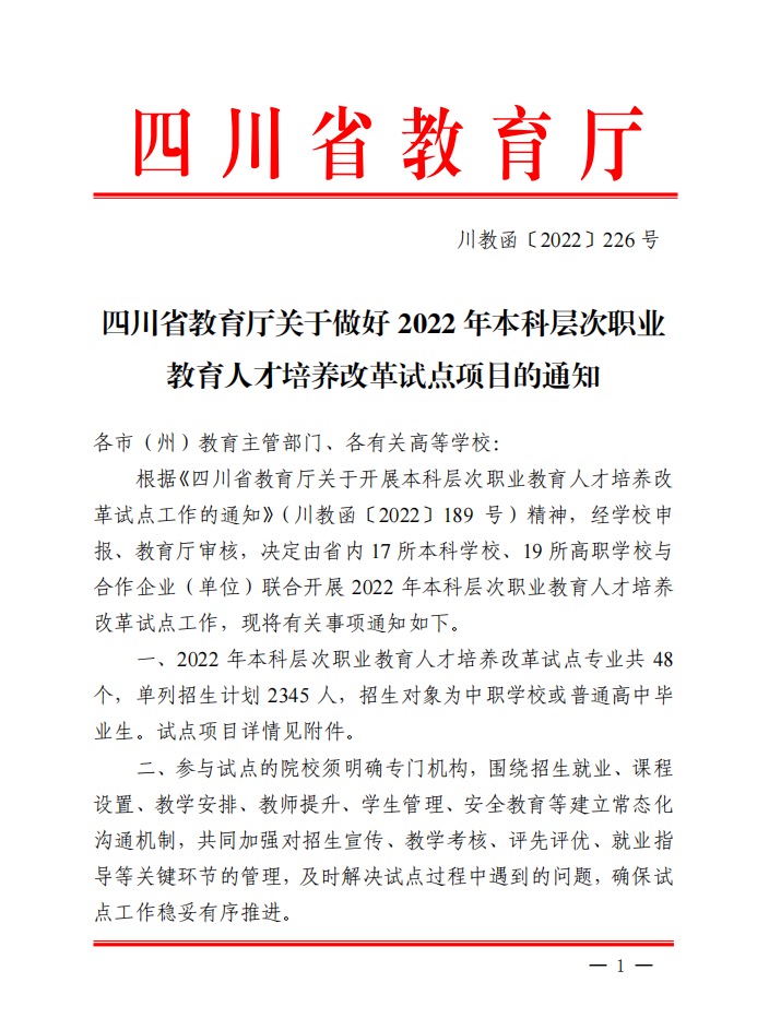 5月21日,四川省教育厅(川教函〔2022〕226号)审核批准四川化工职业技术学院“化学工程与工艺”专业作为“2022年本科层次职业教育人才培养改革试点项目”。