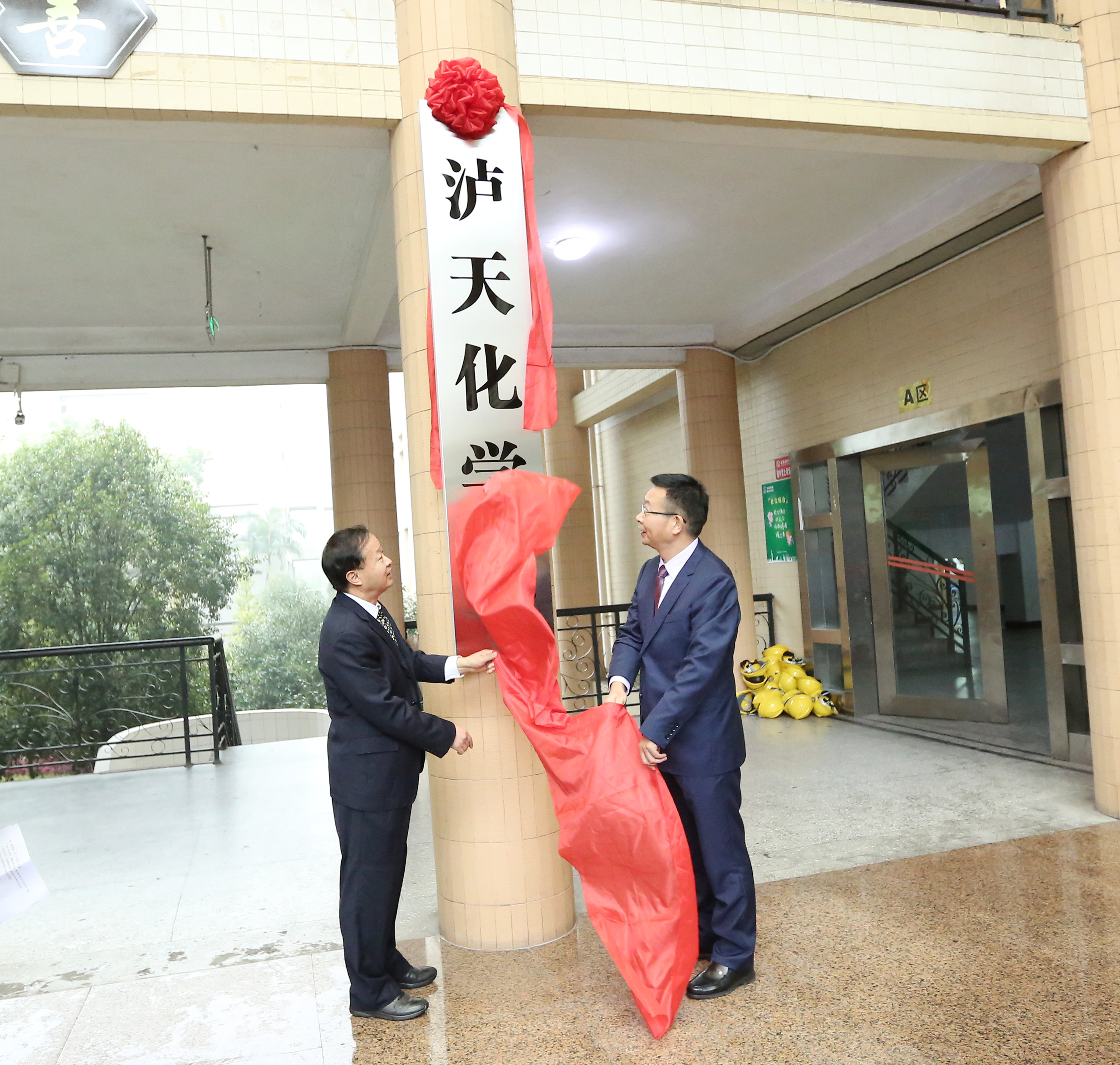 在综合教学楼大厅,谭光军与刘志勇共同为泸天化学院揭牌。随后,校企双方在行政楼三楼会议室举行了座谈会。