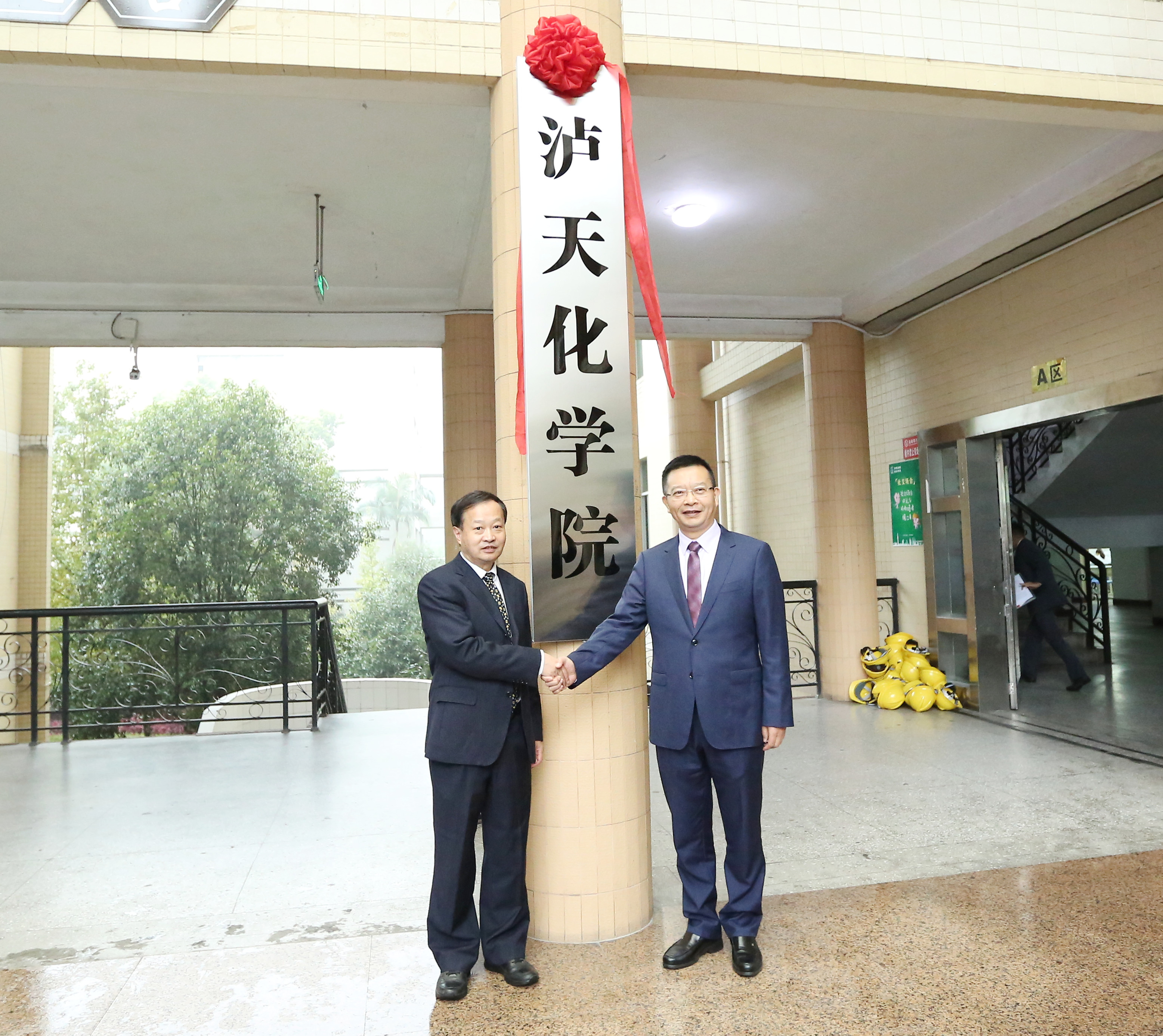 10月27日,四川化工职业技术学院泸天化学院挂牌仪式在学校隆重举行。泸天化(集团)有限责任公司党委书记、董事长谭光军,泸天化股份有限公司党委副书记陈伟,天华股份有限公司党委副书记王敏,中蓝新材料公司党委副书记刘勇,学校党委书记刘志勇,党委副书记、纪委书记、工会主席陈淑娟,党委委员、副院长王志斌,副院长邓启华参加挂牌仪式,党委委员、副院长蒲开伦主持挂牌仪式。